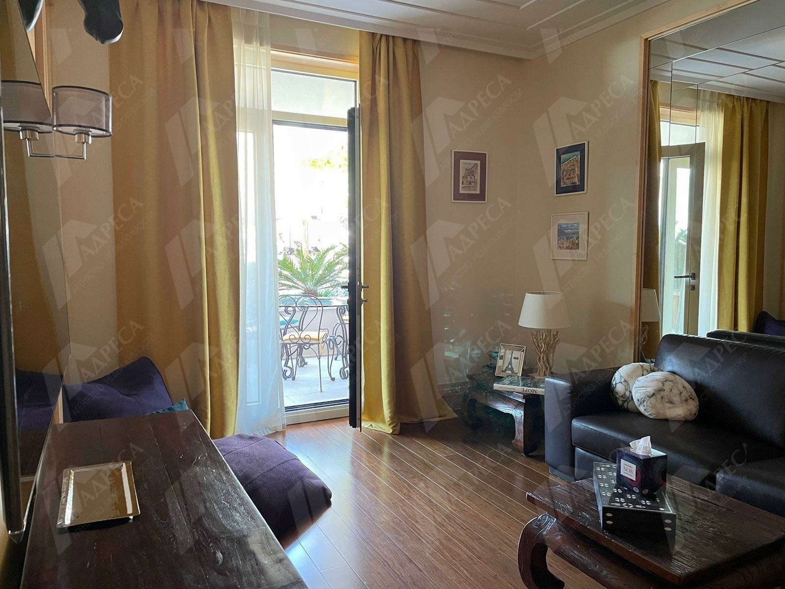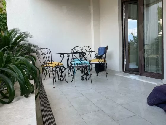 Структура квартиры: гостиная с панорамными окнами, выделенная зона кухни, 1 спальня, большой санузел с ванной, большая терраса. Квартира полностью меблирована и оснащена бытовой техникой. С террасы есть боковой вид на море.